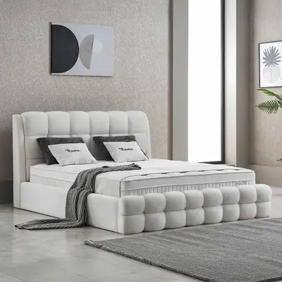 De Boxspring met opbergruimte Kaona is ontworpen om zowel esthetisch als functioneel te zijn. Met afmetingen van 200 × 140 × 103 cm biedt het bed een royaal slaapoppervlak. Verkrijgbaar in drie verschillende maten (140×200 cm), kunt u het bed aanpassen aan uw eigen voorkeuren en de grootte van uw slaapkamer. De Boxspring met opbergruimte Kaona is uitgevoerd in een elegante witte kleur, die zich gemakkelijk aanpast aan verschillende interieurstijlen.